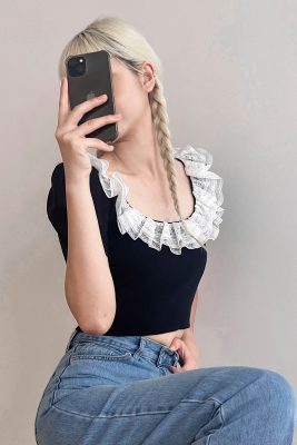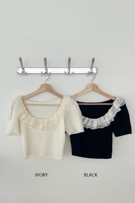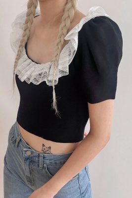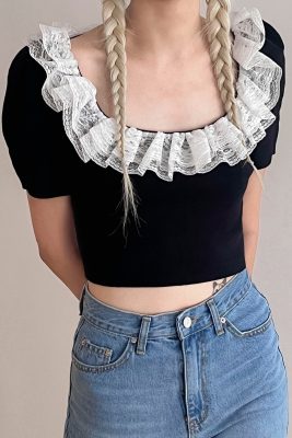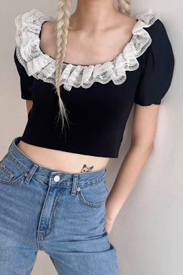 - Rounded square neck with lace inset